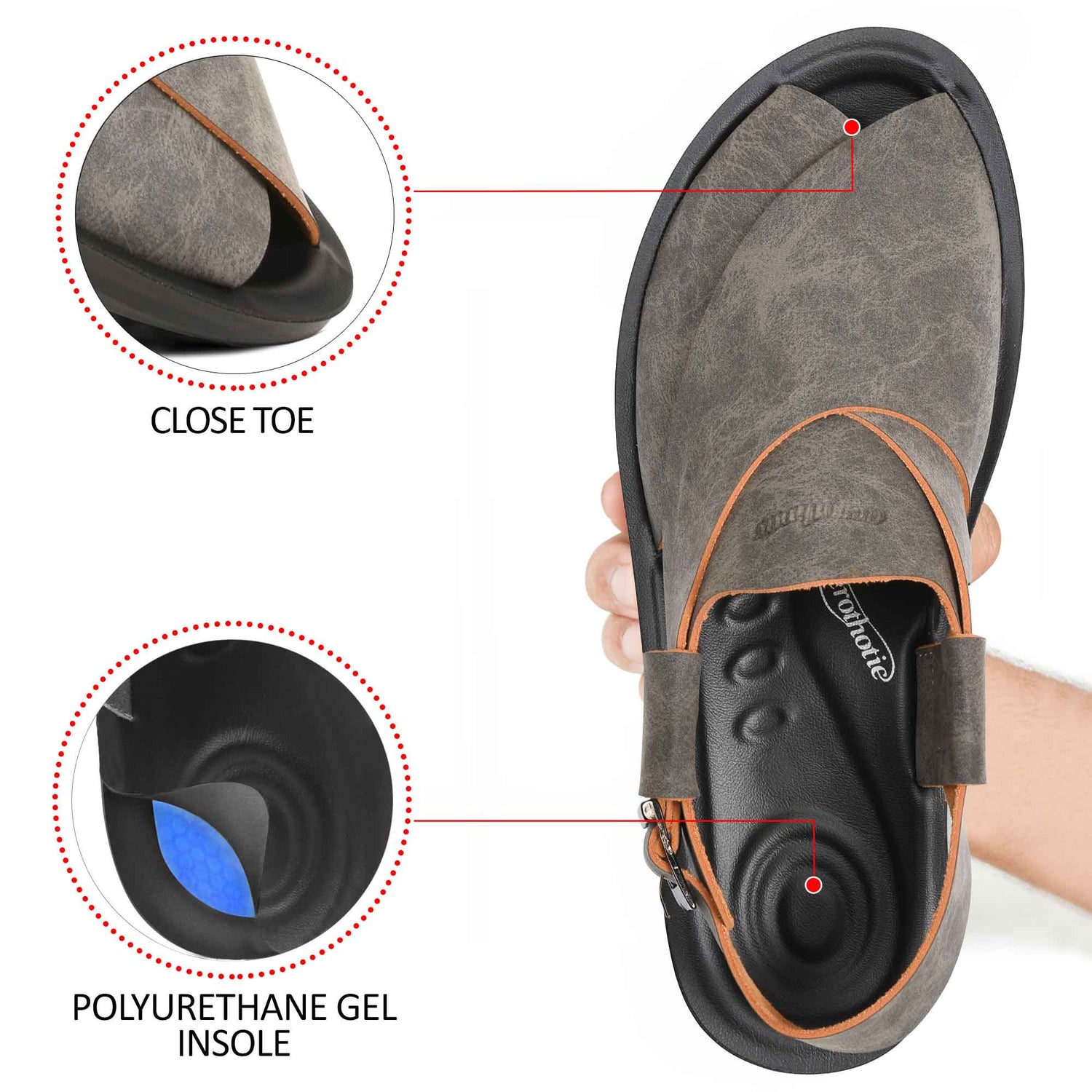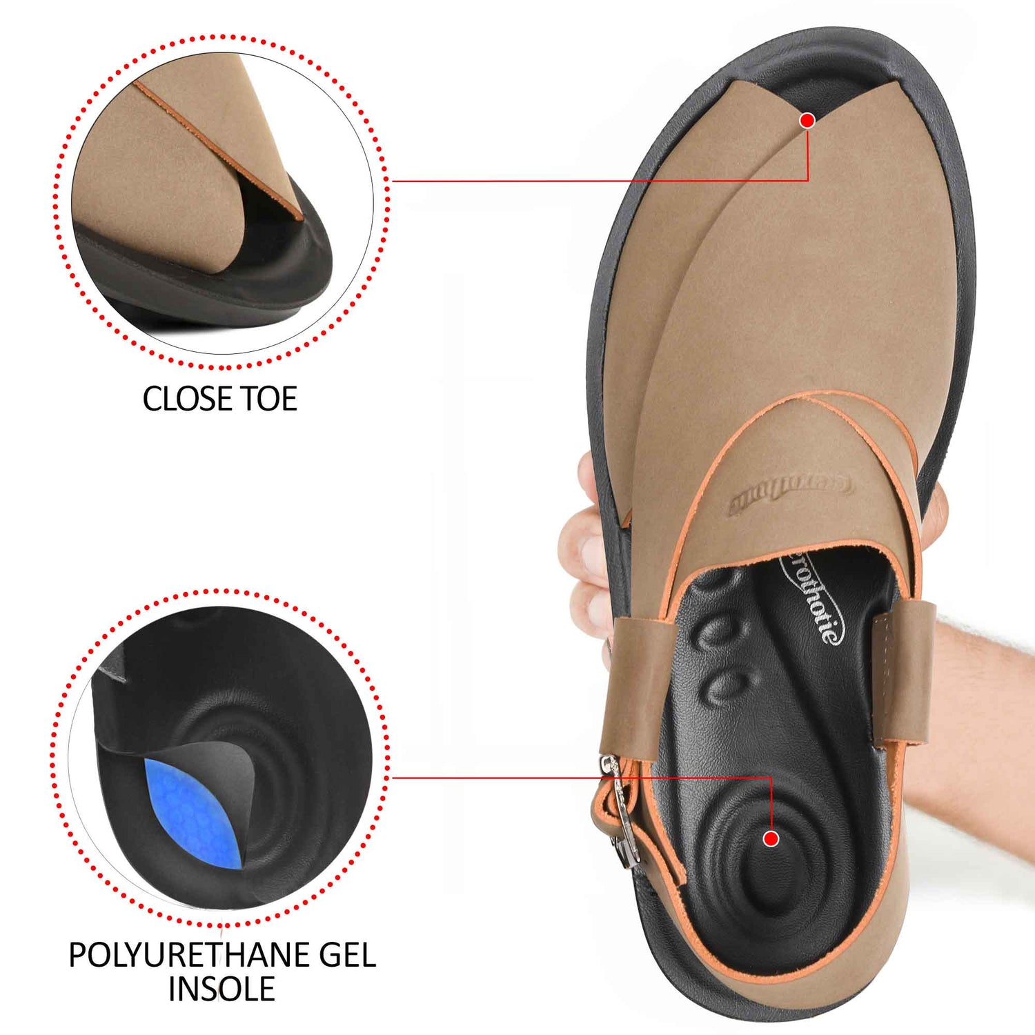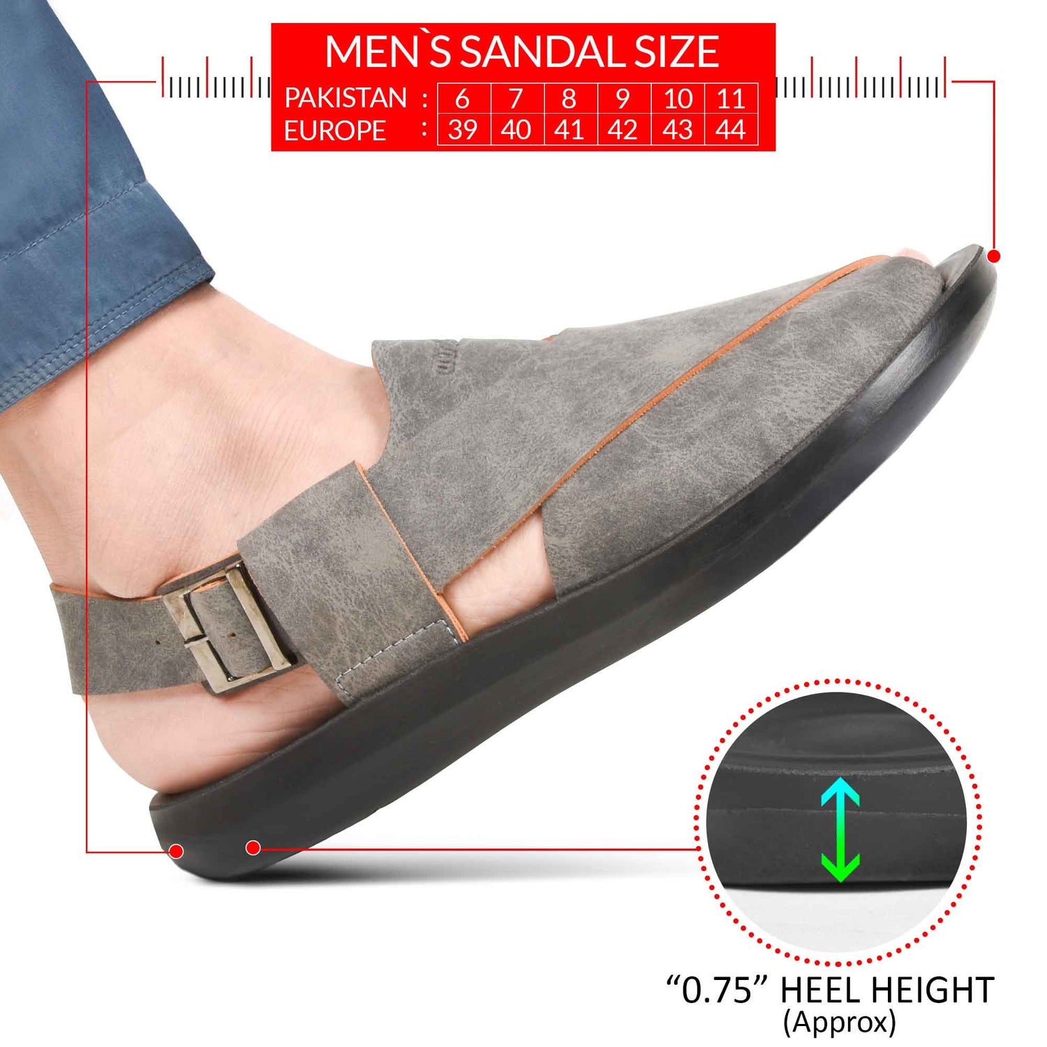 Simple yet stylish, these Peshawari style gents sandals are a delight for your feet. Crafted with synthetic leather, they're perfect for every event. With a pin buckle closure, they're easy to adjust. The medial arch support and profound heel cup make them a must for your daily wear. Comfortable and chic, they're the ultimate choice, perfect for every event. Be the fashion inspo, slip into these trendy closed toe sandals for men.