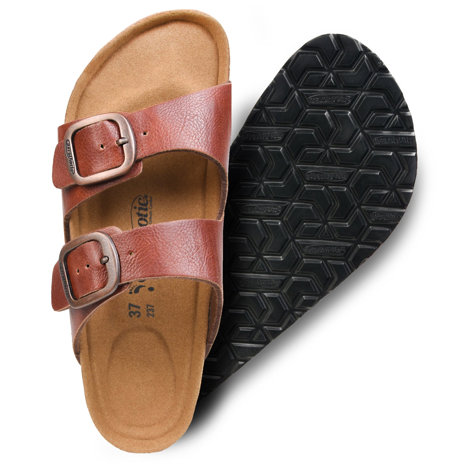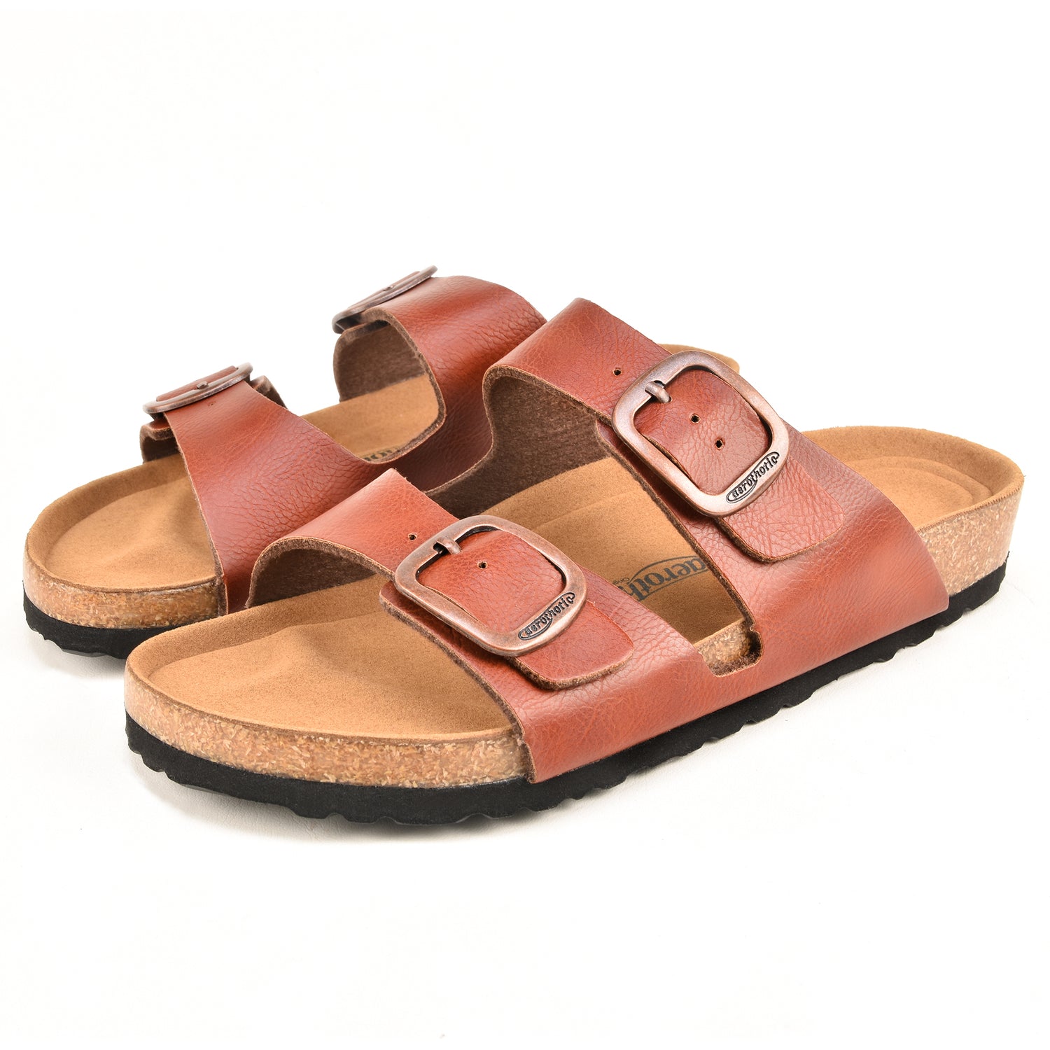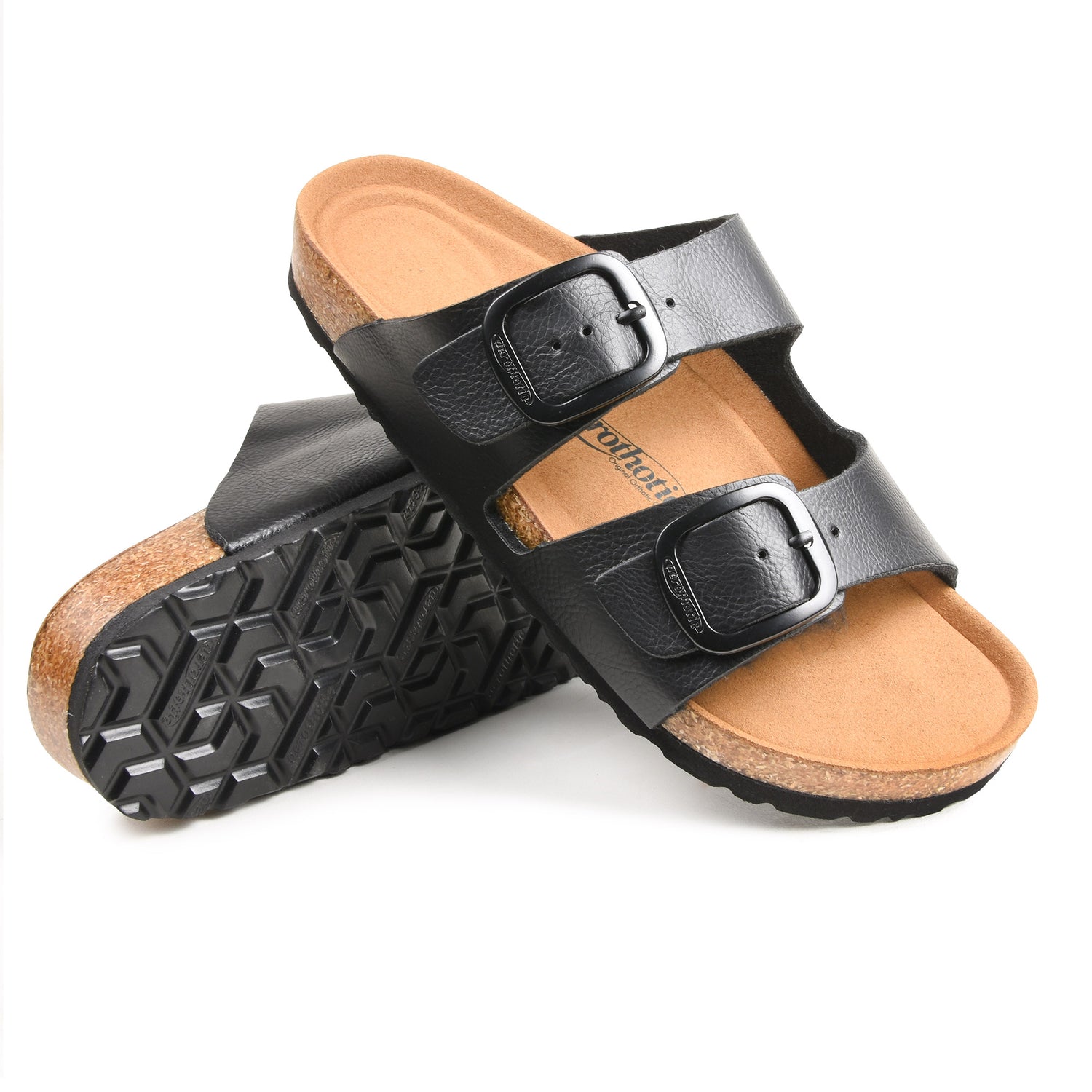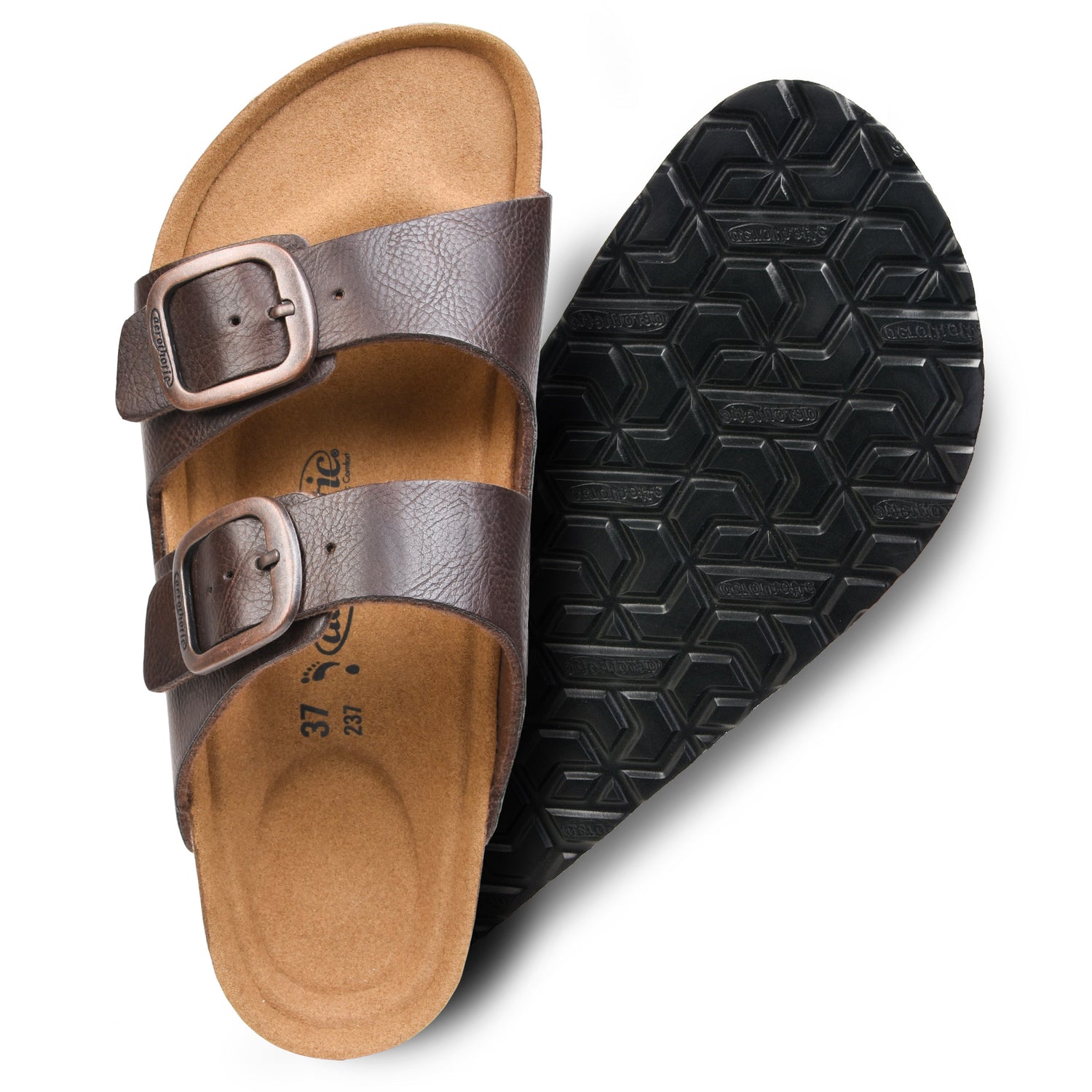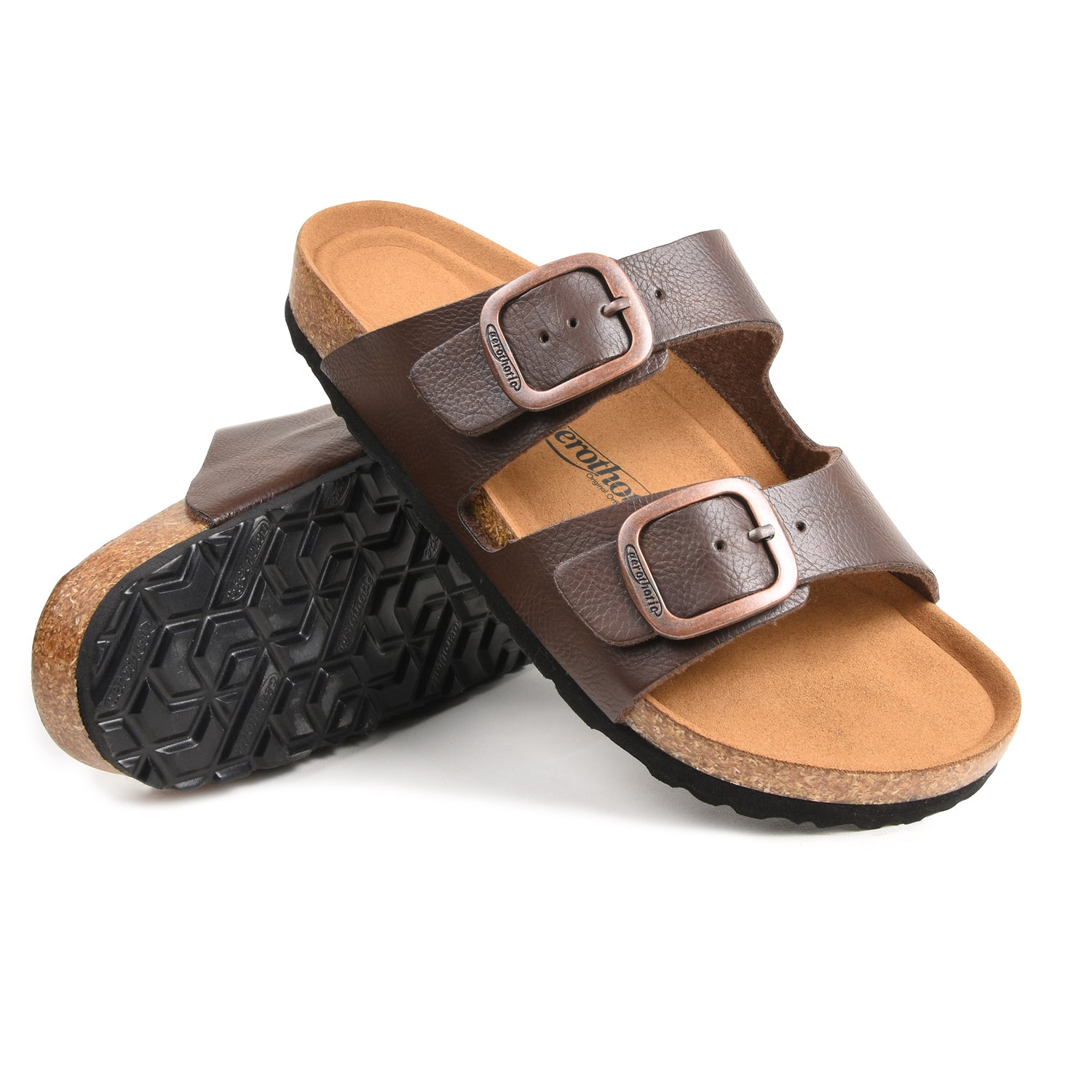 We heard you calling for convenient luxury, and here you go. Arete (PU1107) dual strap sandals are our ultimate find of the year to satisfy your style and comfort cravings. Unisex sandals with arch support are reliable to pick for a day out with your friends or off-trail walking. The uniquely formed cork footbed offers a stable fitting to every foot and fills the arch cavity while you wear them for an ideal tread. Its high-quality material serves the purpose by increasing product durability. The sturdy outsole with geometrical pattern functions well to resist unwanted shocks and acts as a safety measure for your feet. Synthetic straps give a secure hold to the entire foot structure, and its elegant buckle is a comeback of contemporary summer style.