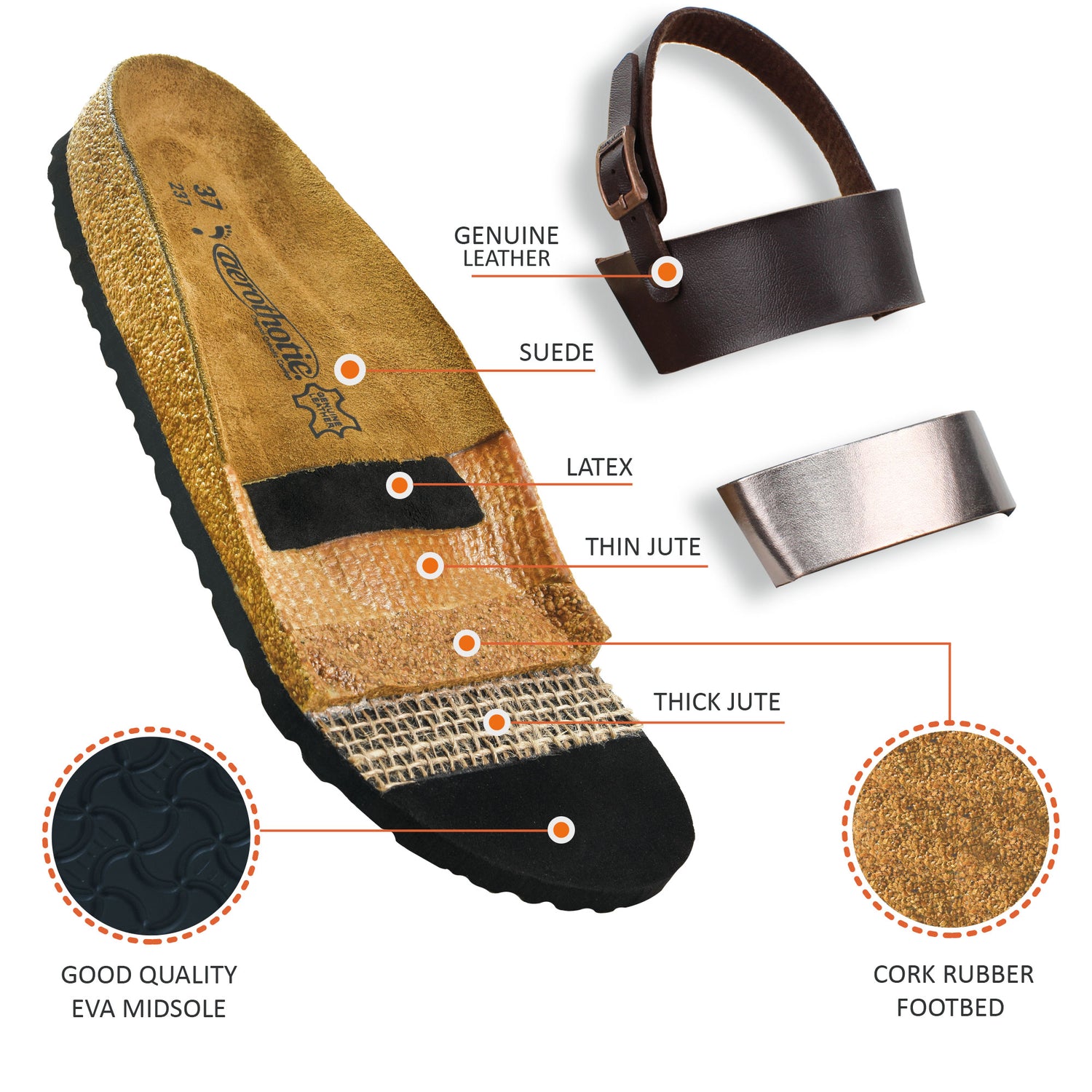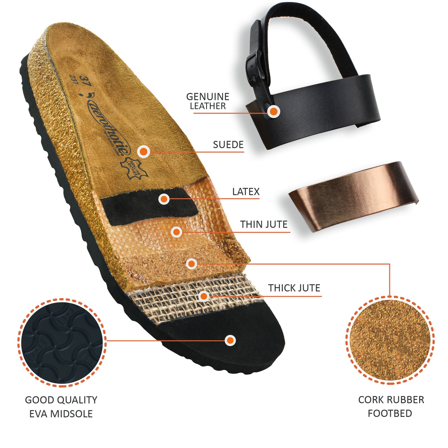 - Cork rubber footbed between jute layers will comfy your feet and the flat EVA outsole will add its bit to the sandal.