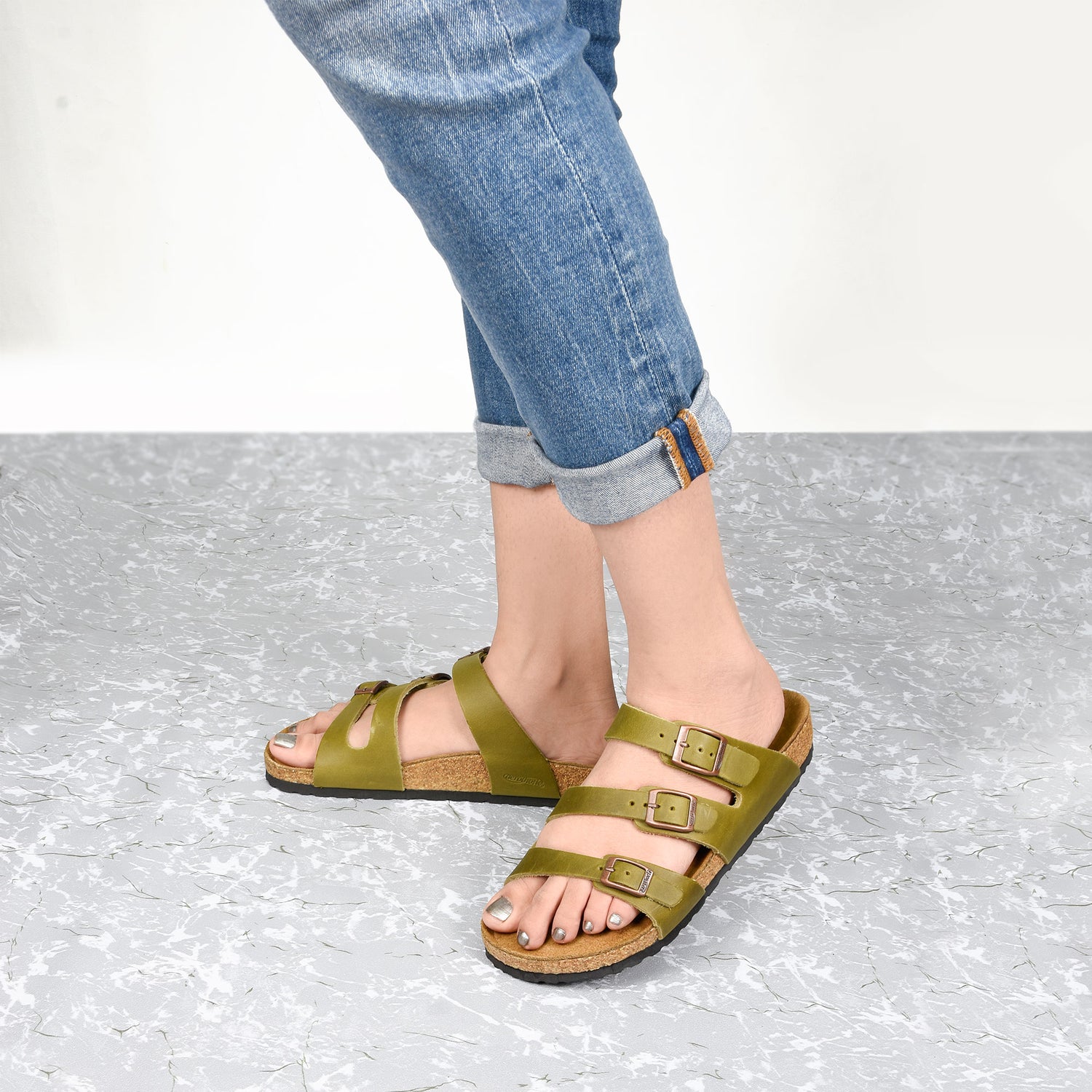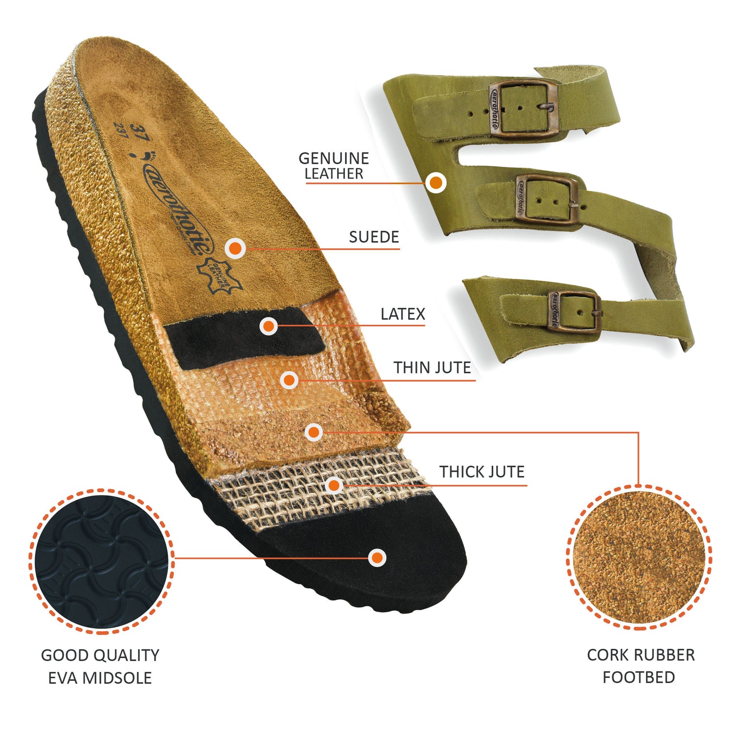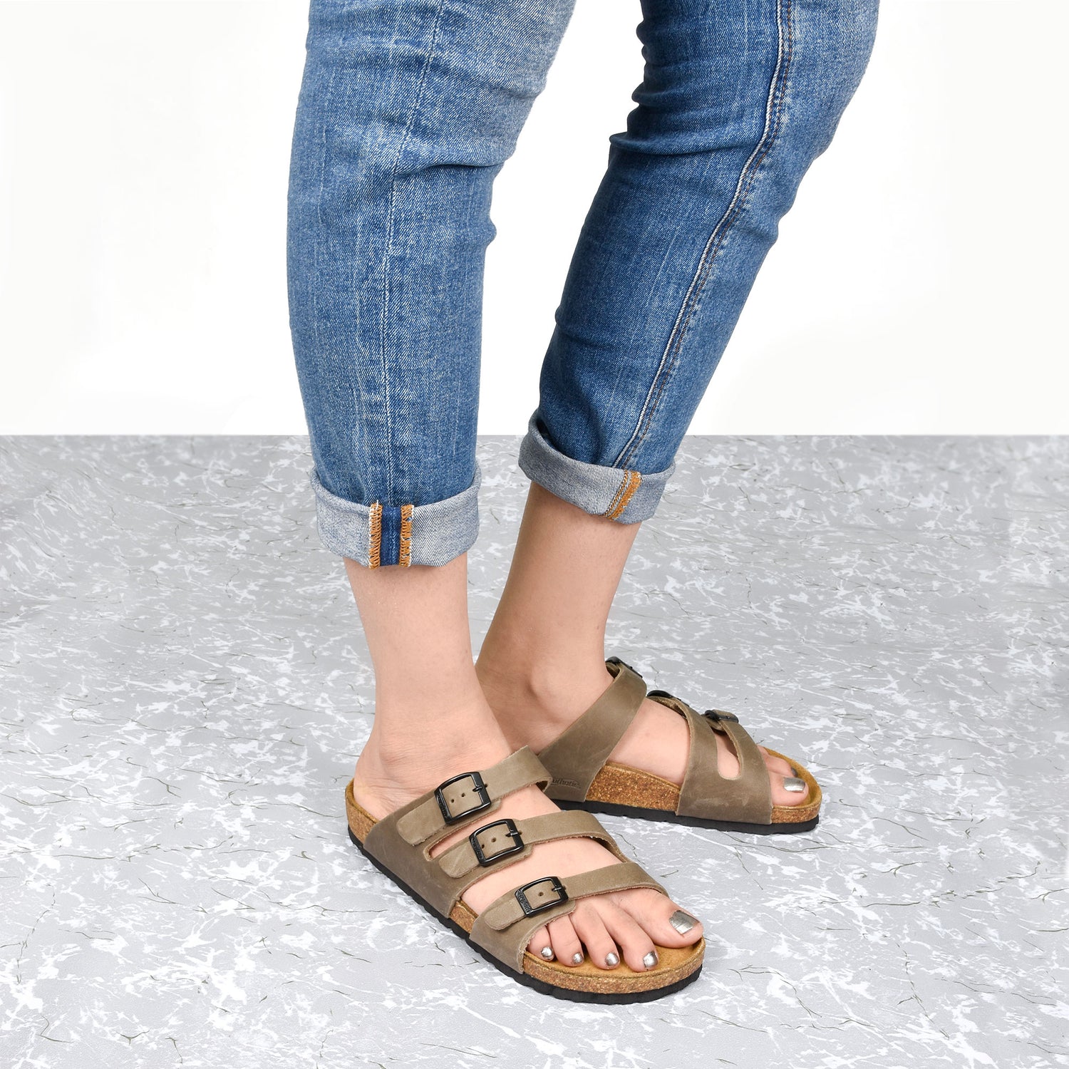 - Tri-leather straps accurately fixed with soft backing at the top for easy walking and comfortable feel all day long.