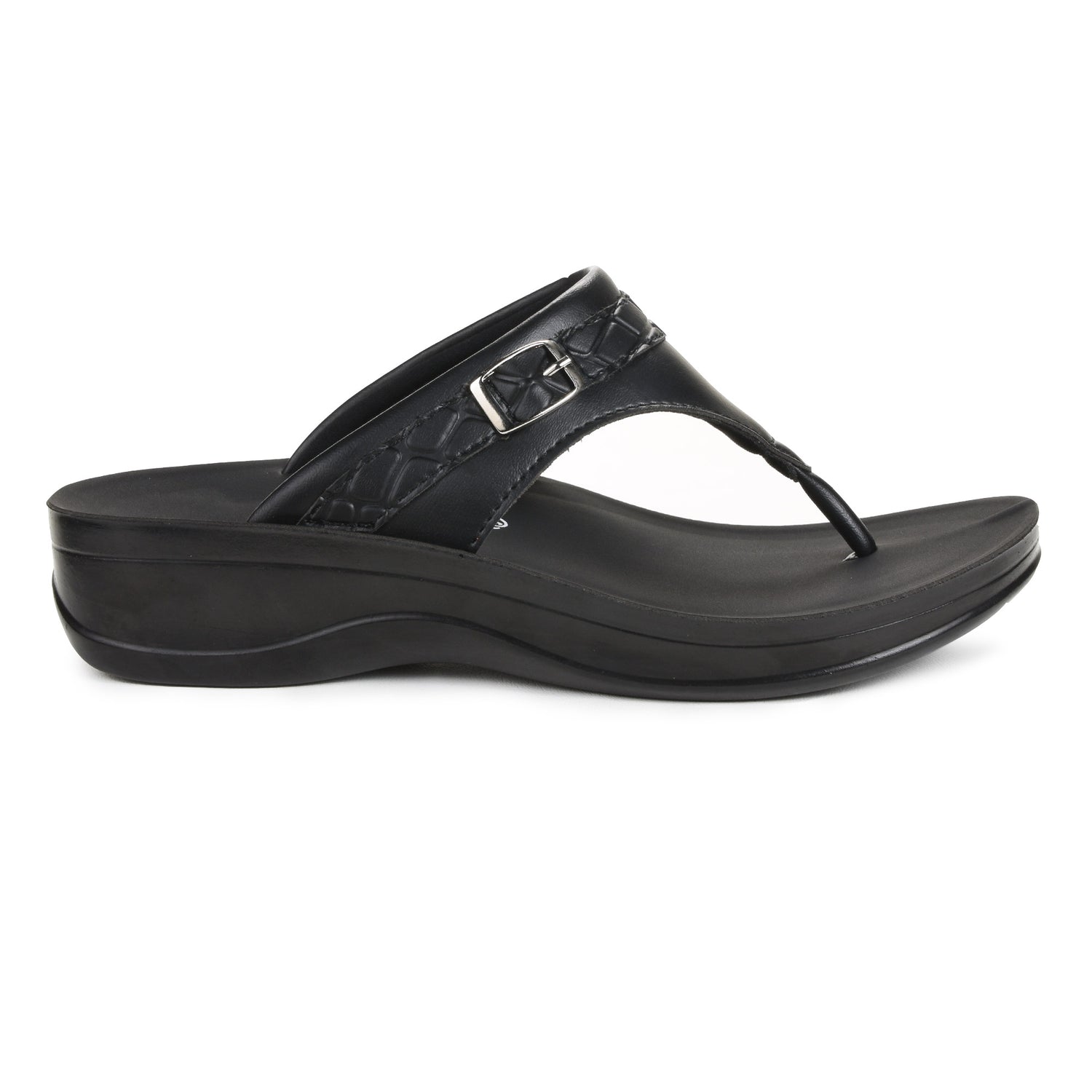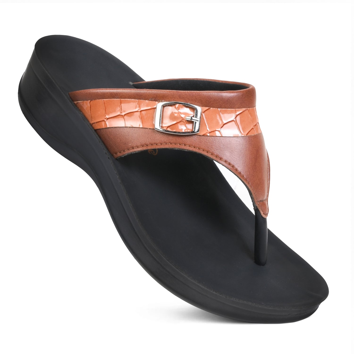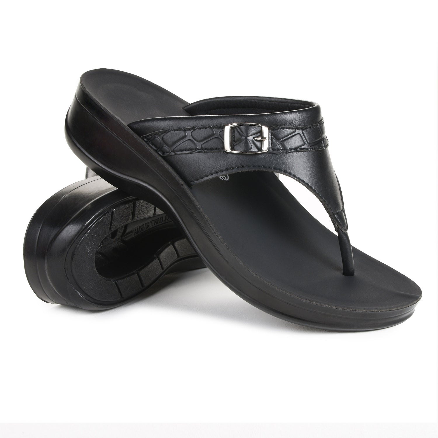 Our platform styled sandals is a mirage of divine comfort and premium quality, where foot’s ease and care is typically taken into consideration. Upper structure of the Mirage (L0805) sandals comprises of a decorative metal buckle strap with a brick patterned outline for all fashion pros, the upper and inner material of the thongs is composed of synthetic leather.