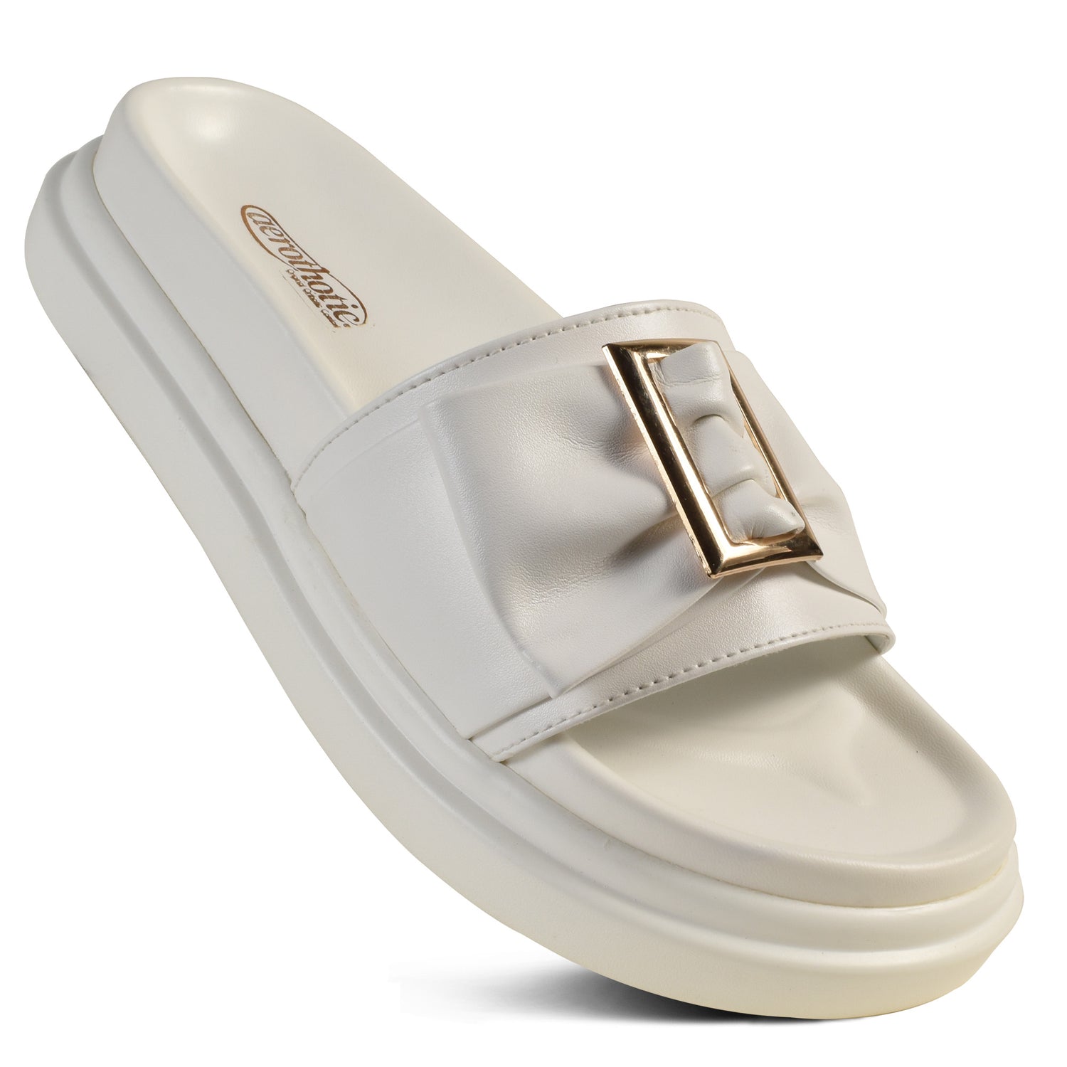 The standout feature is the stylish wide strap adorned with a pleated bow and a sleek metallic buckle detail, adding a touch of sophistication and feminine charm. The platform sole offers a modern look while providing added height and stability.