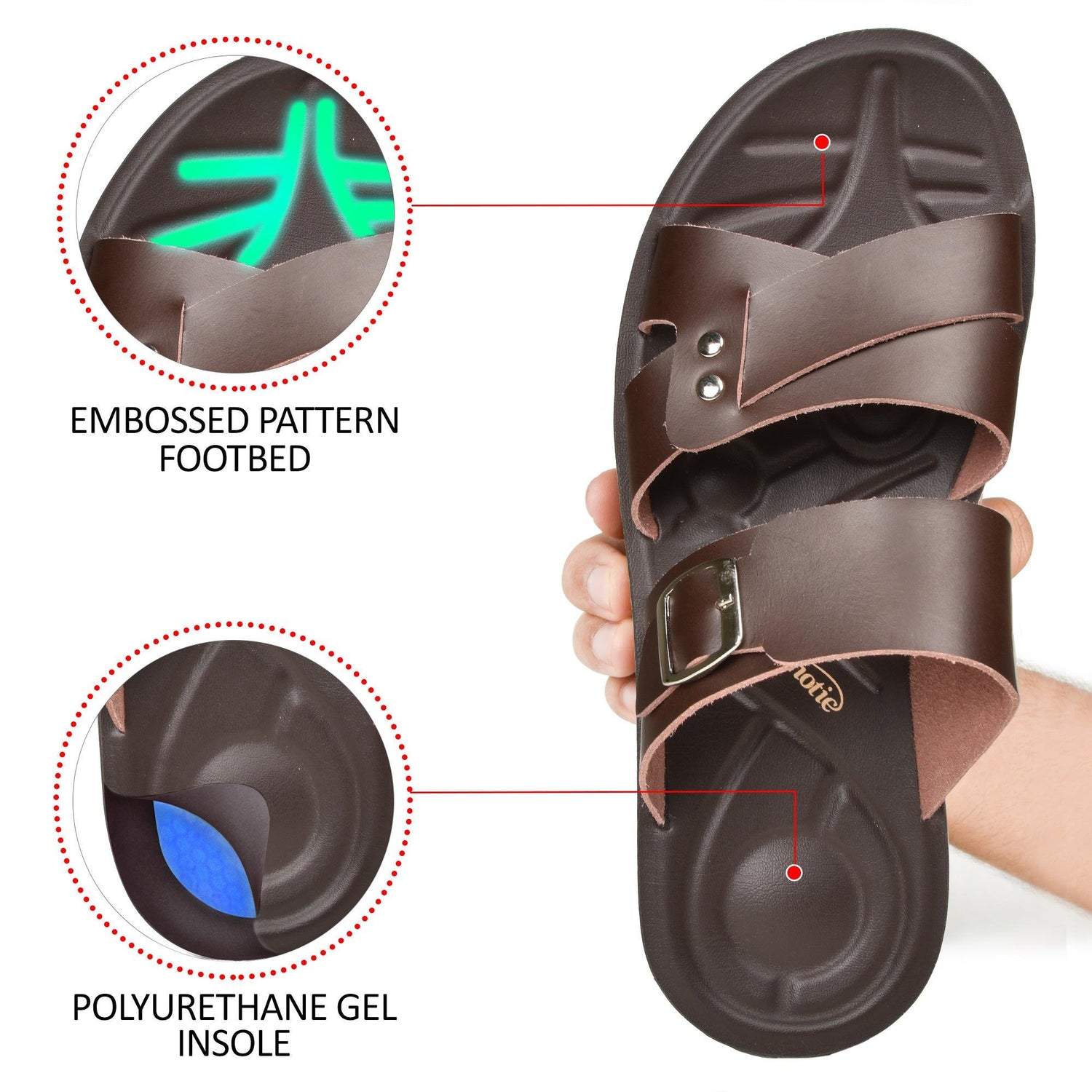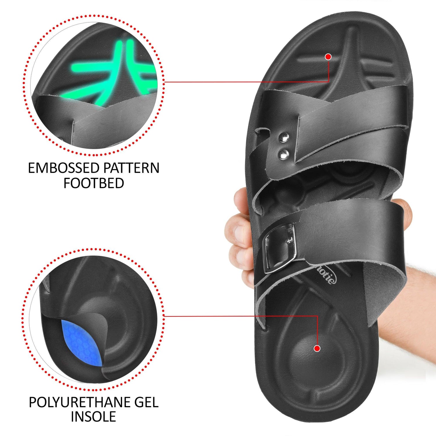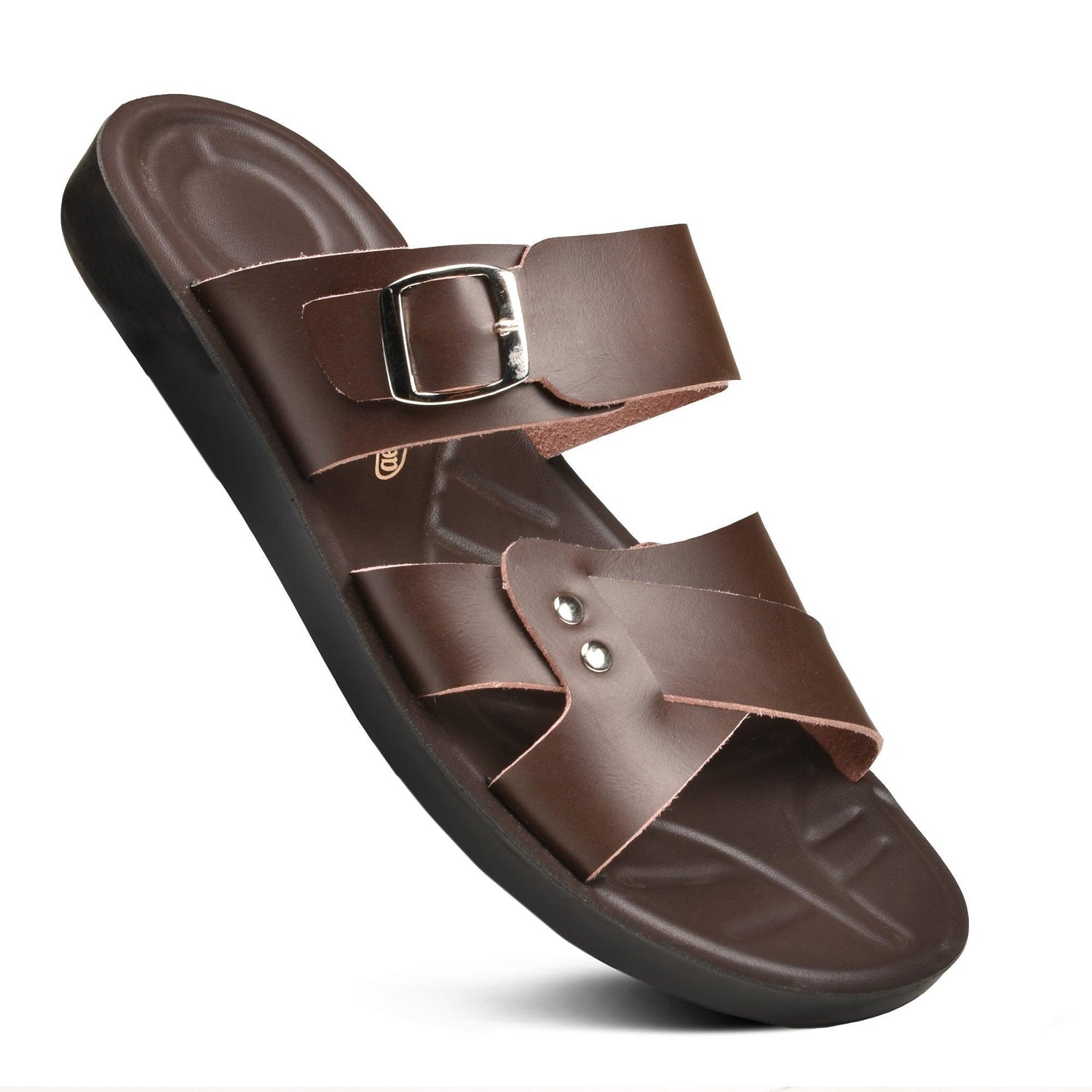 Supportive soles keep the feet comfortable as they stabilize the heel and distribute the weight evenly across your entire foot. A modern style strappy sandal M1312 is a perfect blend of form and function. Aerothotic slide sandals for men are designed to reduce pressure from the certain foot spots. The synthetic leather straps with adjustable metal buckle allows maximum breathability keeping your feet fresh and healthy. The polyurethane sole proffers flexibility and resists shocks from sudden tripping.