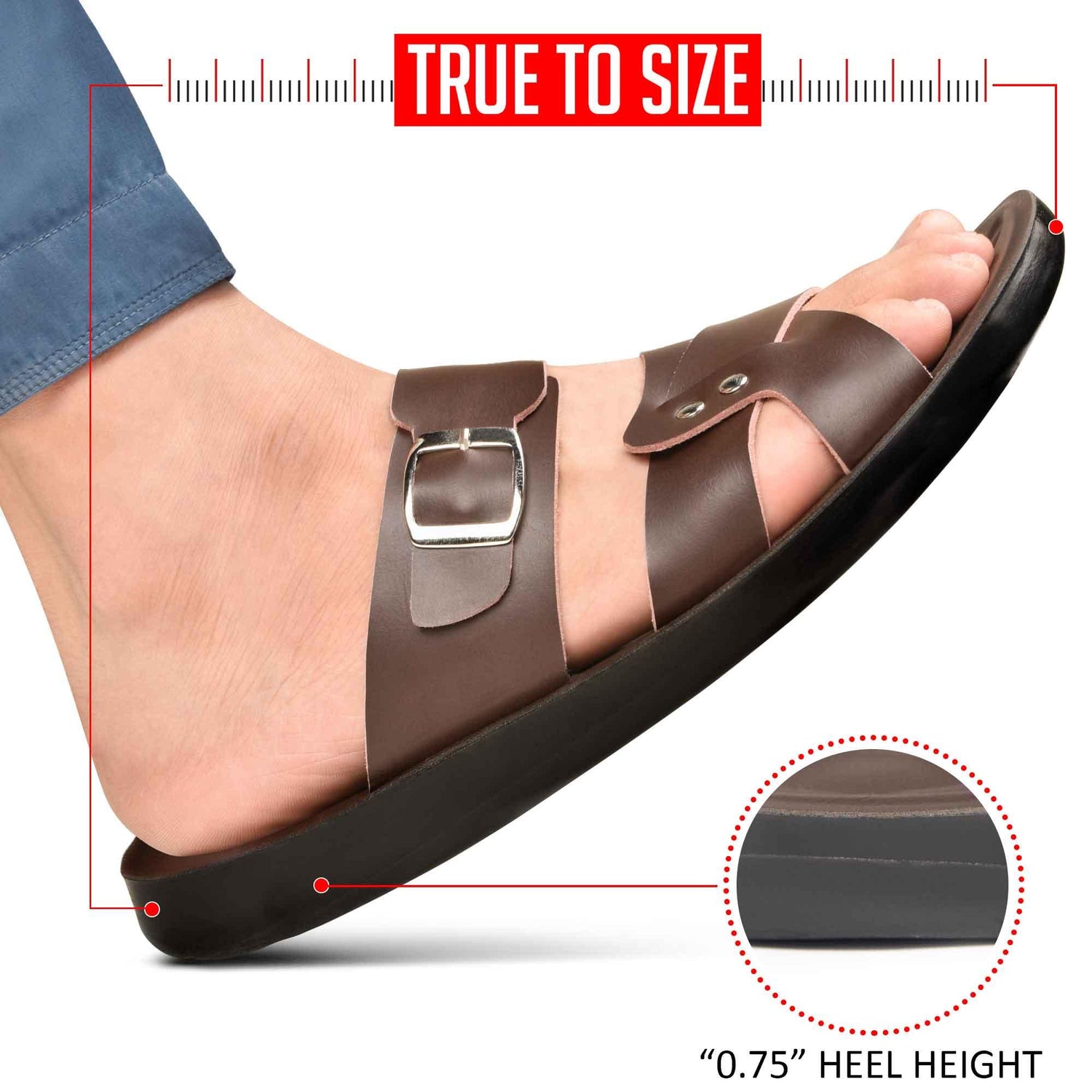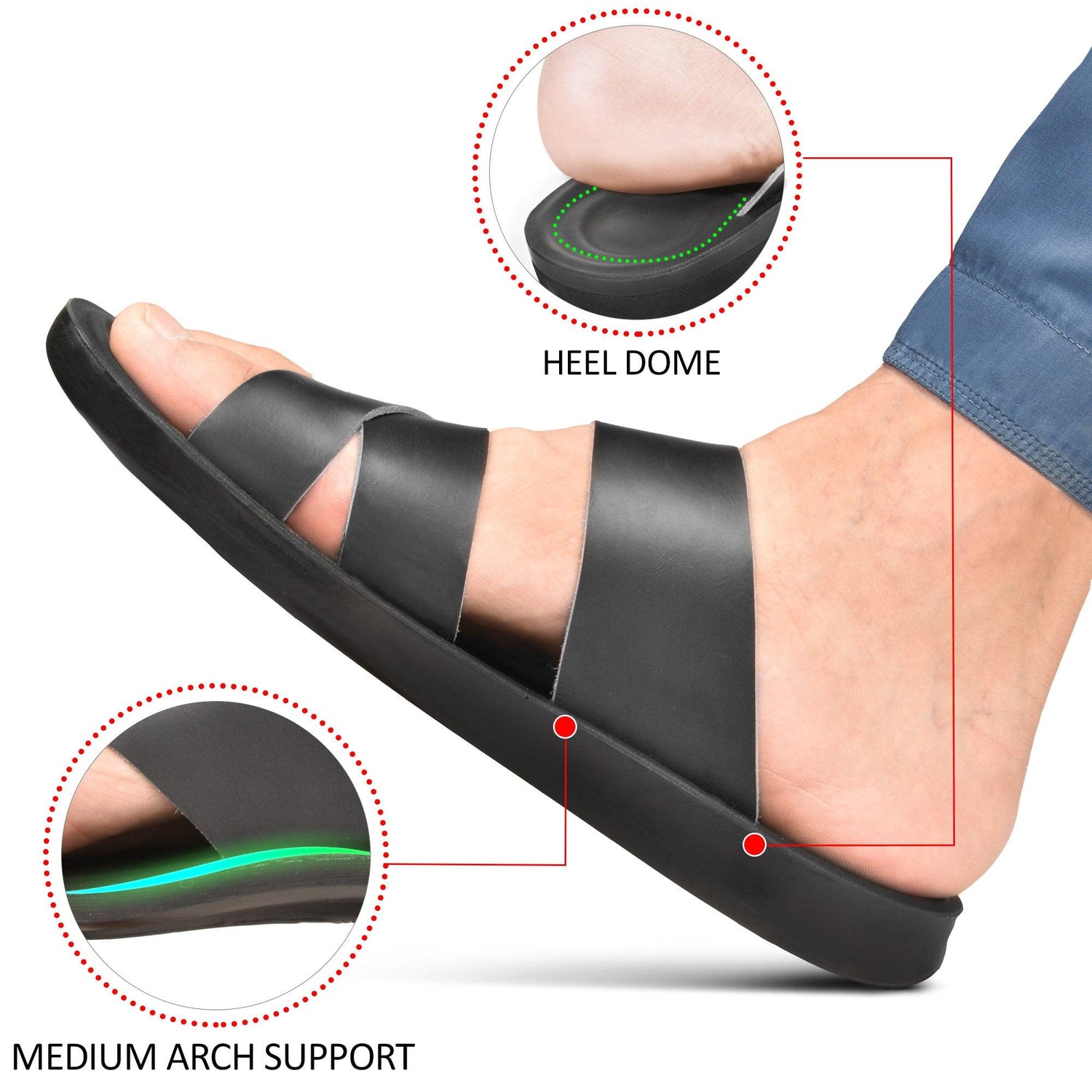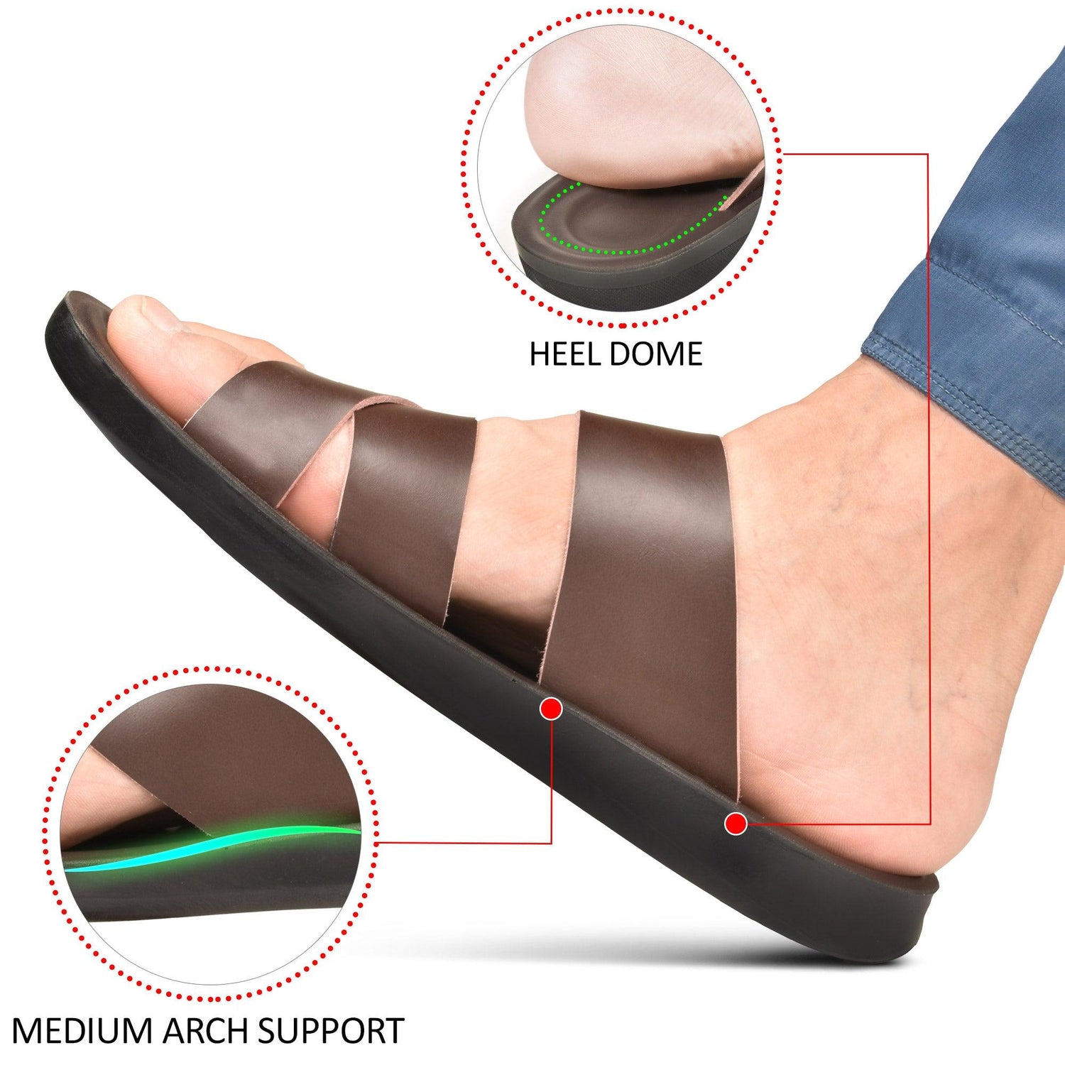 Supportive soles keep the feet comfortable as they stabilize the heel and distribute the weight evenly across your entire foot. A modern style strappy sandal M1312 is a perfect blend of form and function. Aerothotic slide sandals for men are designed to reduce pressure from the certain foot spots. The synthetic leather straps with adjustable metal buckle allows maximum breathability keeping your feet fresh and healthy. The polyurethane sole proffers flexibility and resists shocks from sudden tripping.