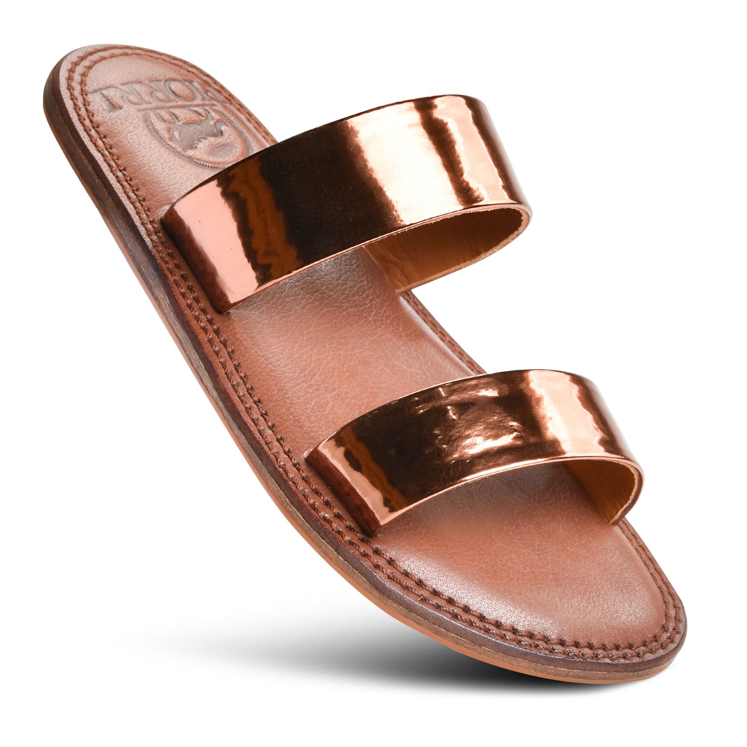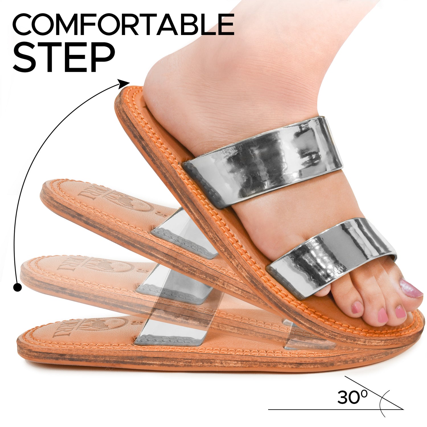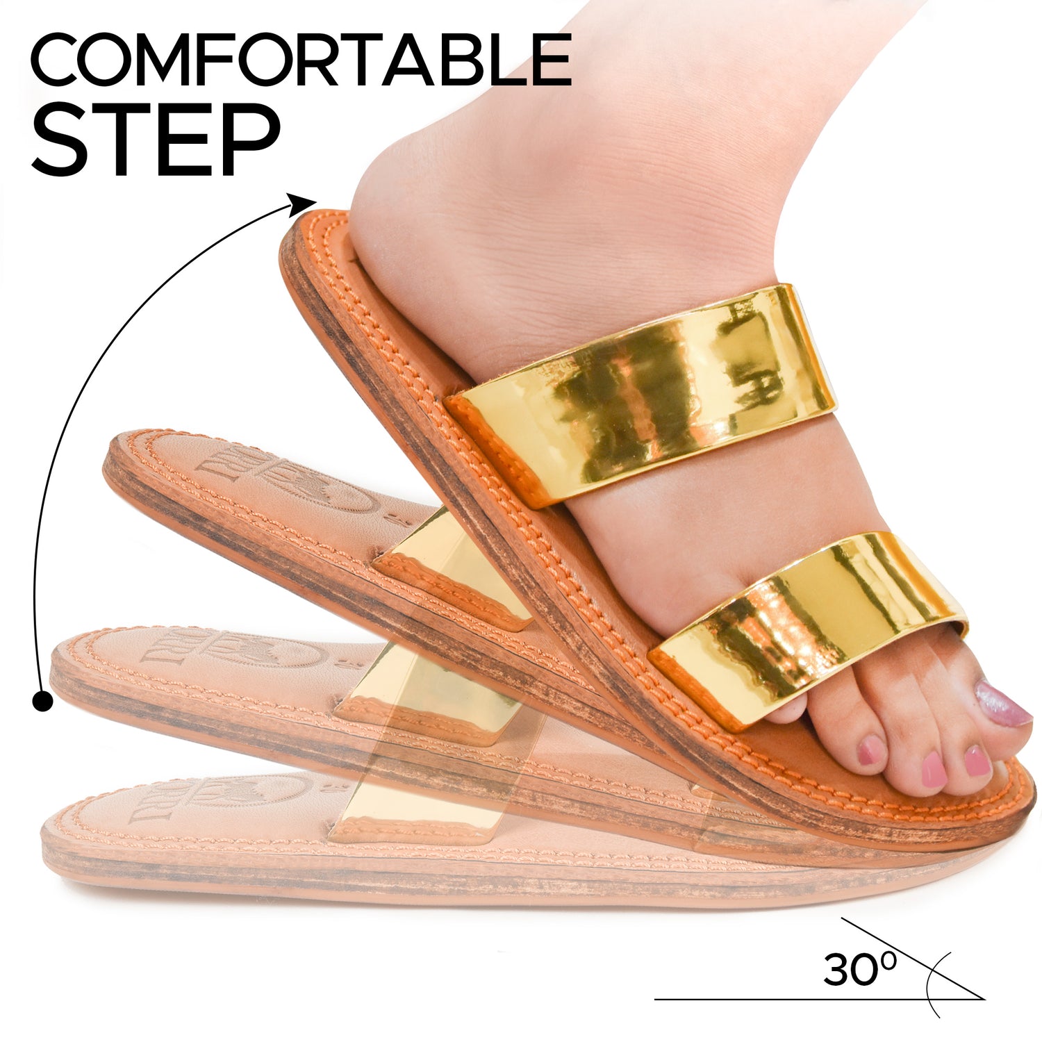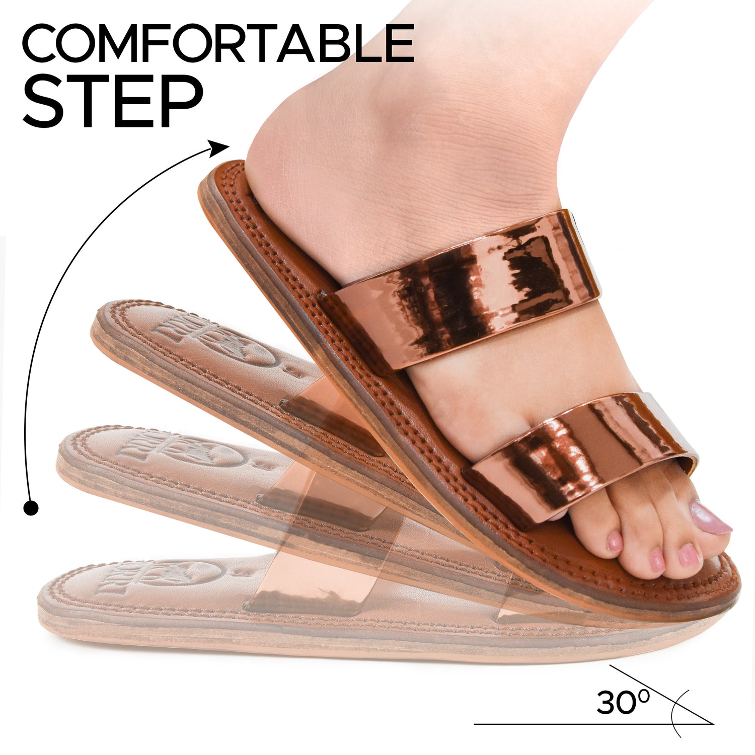 When it comes to slides, these ought to be the elegant and most refreshing option to style. Our double strap handmade natural leather sandals for women are easy-to-wear and the best to lean into the current fashion trends. The built-in arch support women slides molds as your foot shape and ensure a proper posture and comfortable walking experience. The sheen strap slides for women will add a statement to your persona with a little extra space to shine.